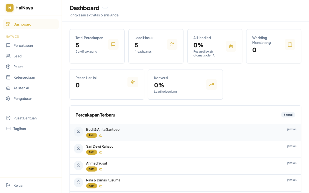 | AI Handled | Persentase chat yang dijawab otomatis oleh Naya |