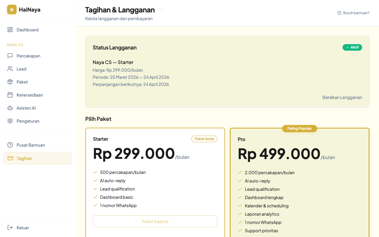 | Starter | Rp 299.000 | 500/bulan | AI auto-reply, lead qualification, dashboard dasar |