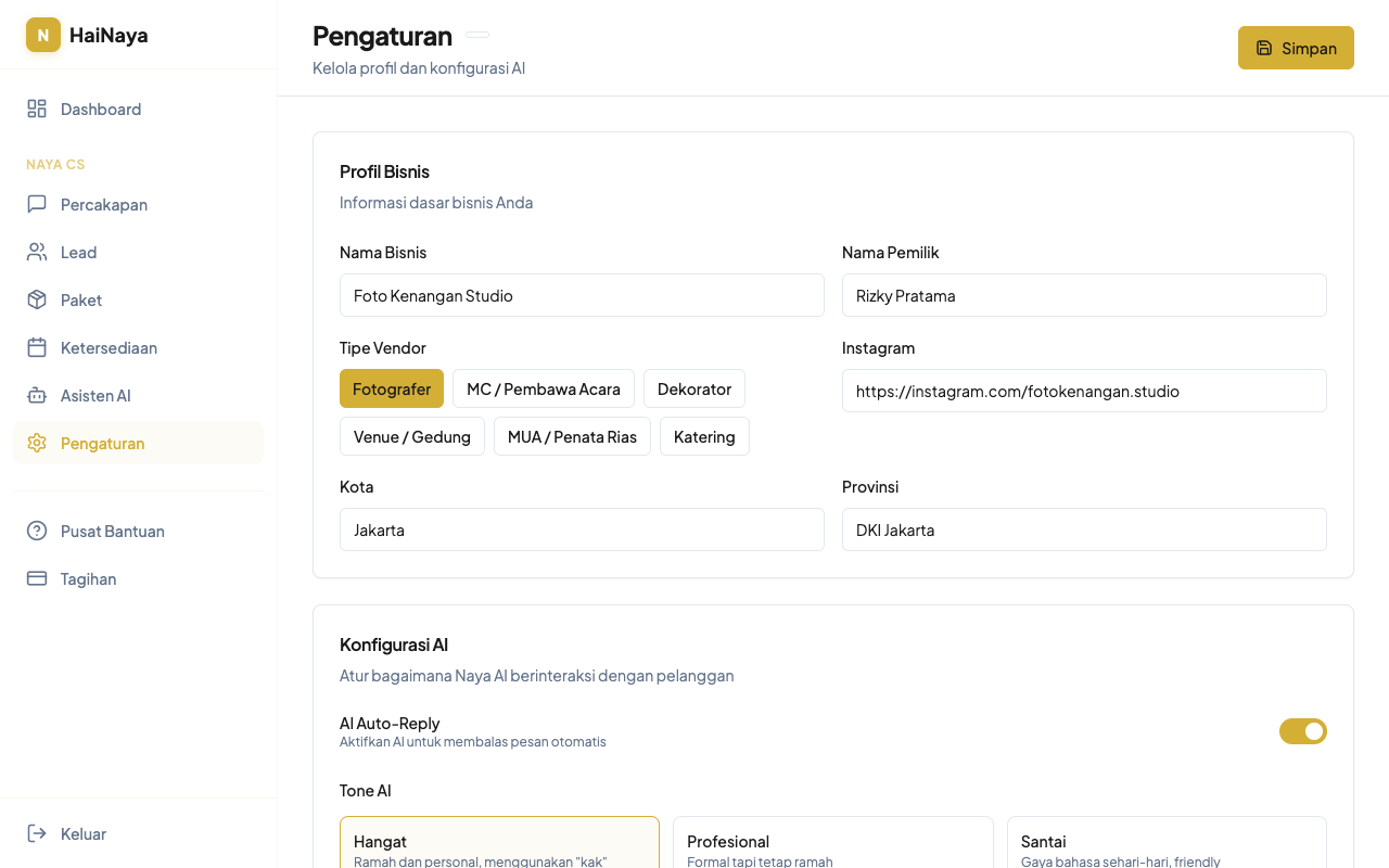 Buka halaman Pengaturan di sidebar untuk mengkustomisasi profil bisnis dan perilaku AI.